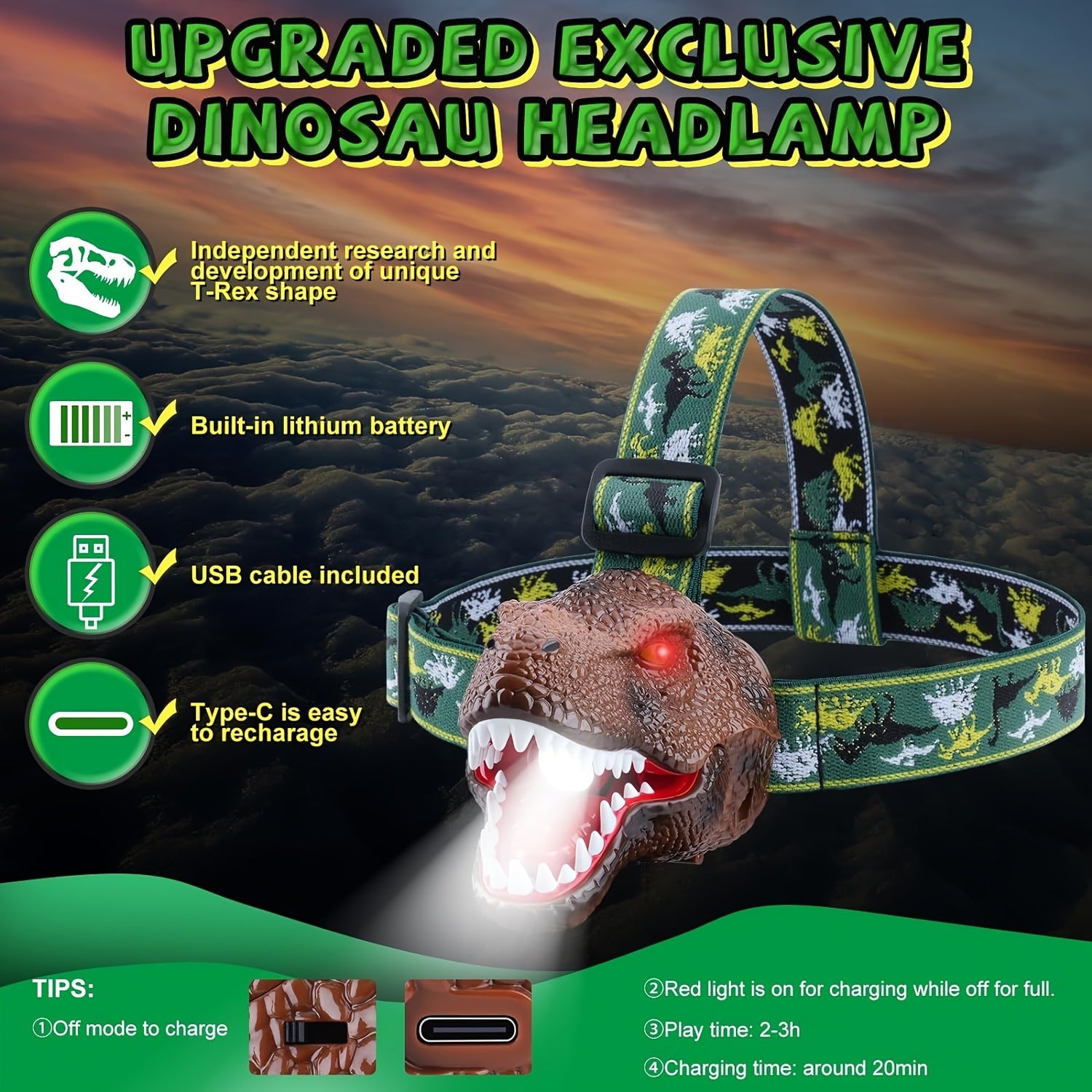 Built for convenience, the T-Rex Beam comes with a fast-charging lithium-ion battery, offering up to 3 hours of continuous use after a quick 20-minute charge. The lightweight yet durable plastic construction makes it easy to wear, while the removable and washable headband adds extra comfort. Whether you need a fun kids’ camping light, a cool night hiking flashlight, or a unique birthday or holiday gift, the T-Rex Beam is the perfect choice for endless adventures!