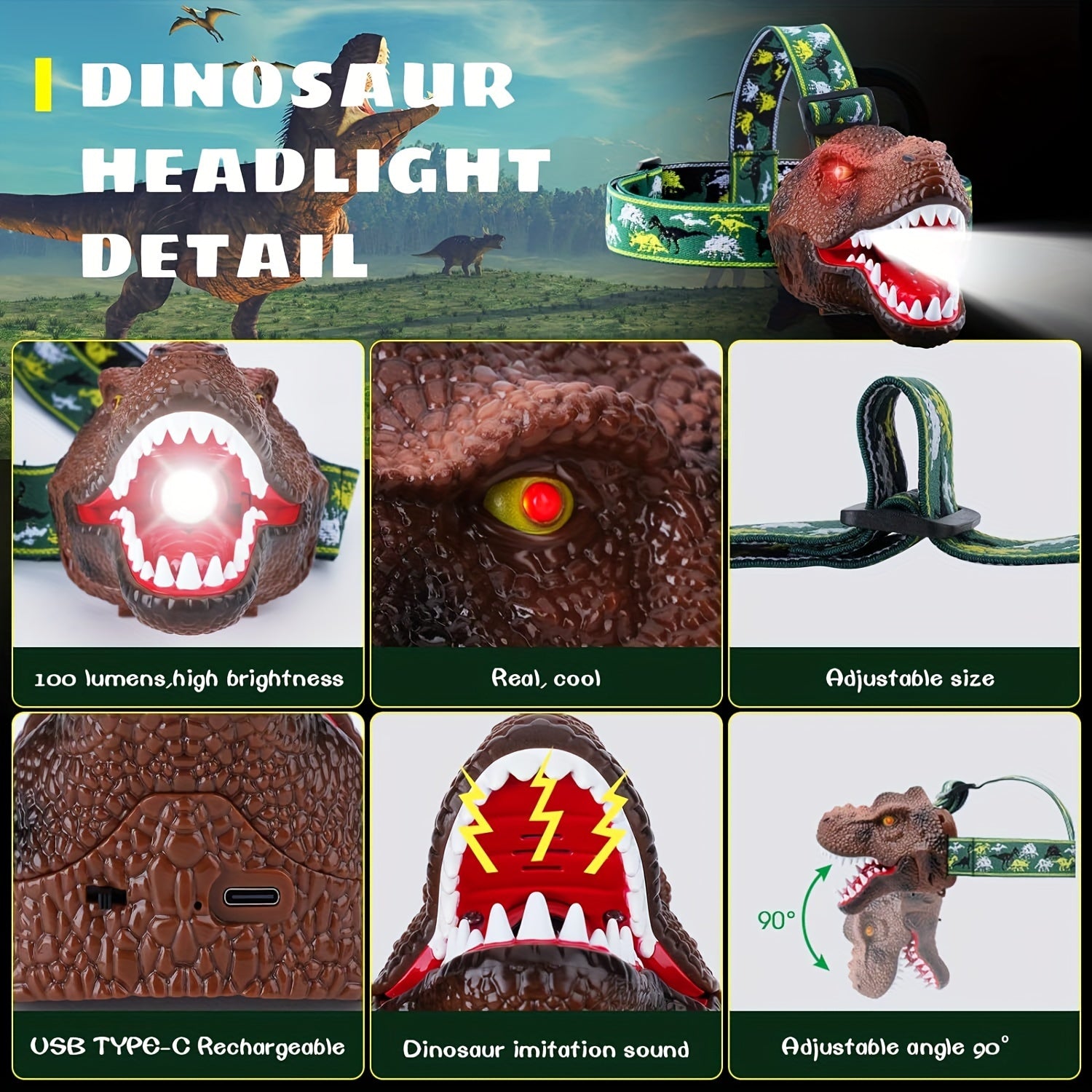 Unleash adventure with the T-Rex Beam – the ultimate dinosaur headlamp that brings fun and function together! Designed for kids and dinosaur lovers, this USB rechargeable LED headlamp features a realistic T-Rex design with roaring sound effects that make every outdoor activity exciting. With four lighting modes, including bright, strobe, roar, and silent, this headlamp provides the perfect illumination for camping, hiking, biking, and exploring. Its adjustable headband ensures a comfortable fit for both kids and adults, while the 180° rotation expands the lighting range for better visibility.