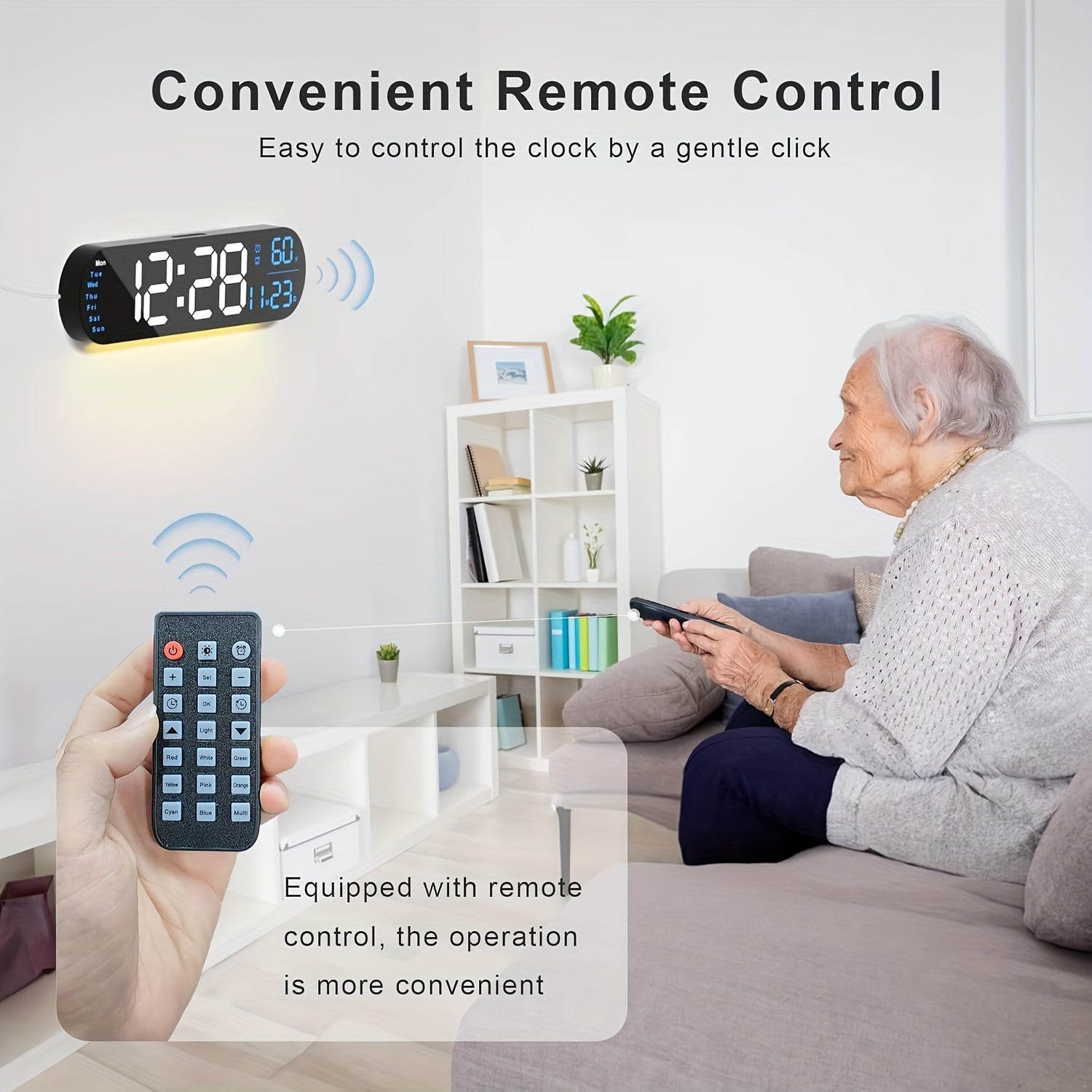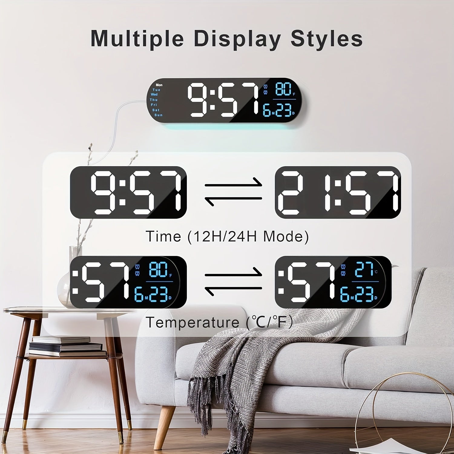Introducing the TimeGlow 13.7" Large Digital Wall Clock, the perfect blend of functionality and style for any room. With its oversized 13.7-inch LED display, this clock makes it easy to read the time, temperature, date, day of the week, and DST, all at a glance. Ideal for seniors or anyone with visual impairments, its large 3-inch digits ensure clarity from a distance. Plus, with its RGB night light feature offering 8 fixed colors and 1 dynamic mode, you can set the mood of your room or use it as a subtle night light to guide you during late-night trips. Whether you're in your living room, kitchen, or office, this modern digital clock is sure to enhance your space.