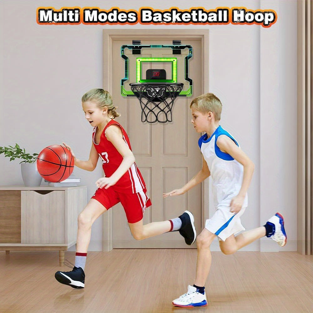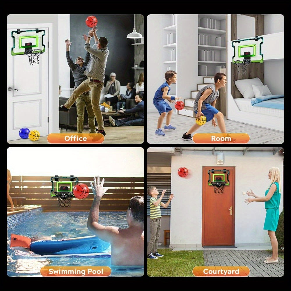 Bring the excitement of the court into your home with the VATOS DunkZone Indoor Electronic Basketball Hoop. Designed for kids, teens, and adults alike, this mini basketball hoop features an electronic scoreboard with LED lights and cheering sounds that celebrate every basket. Whether you're working on your shot or just need a quick break, the automatic scoring system and fun sound effects make every game more thrilling. With a durable polycarbonate backboard and a spring-loaded breakaway rim, you can dunk and shoot just like the pros, all while enjoying a realistic basketball experience in your bedroom, office, or game room.